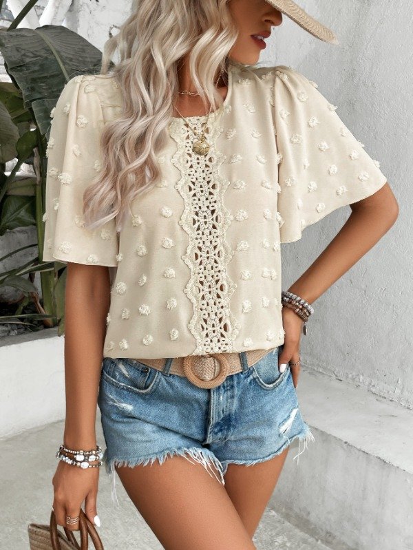Blusa Escote Redondo. Manga Corta Mariposa. Plumetí con Encaje.