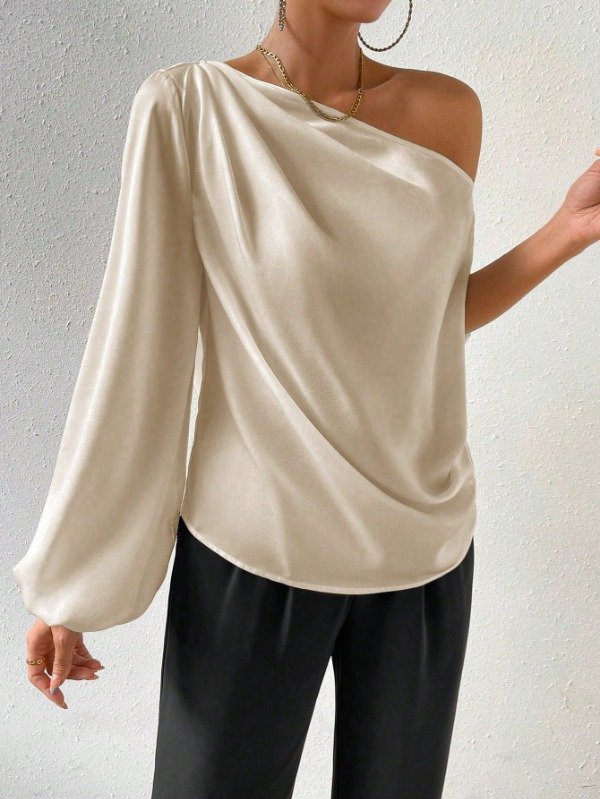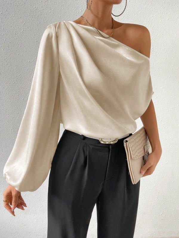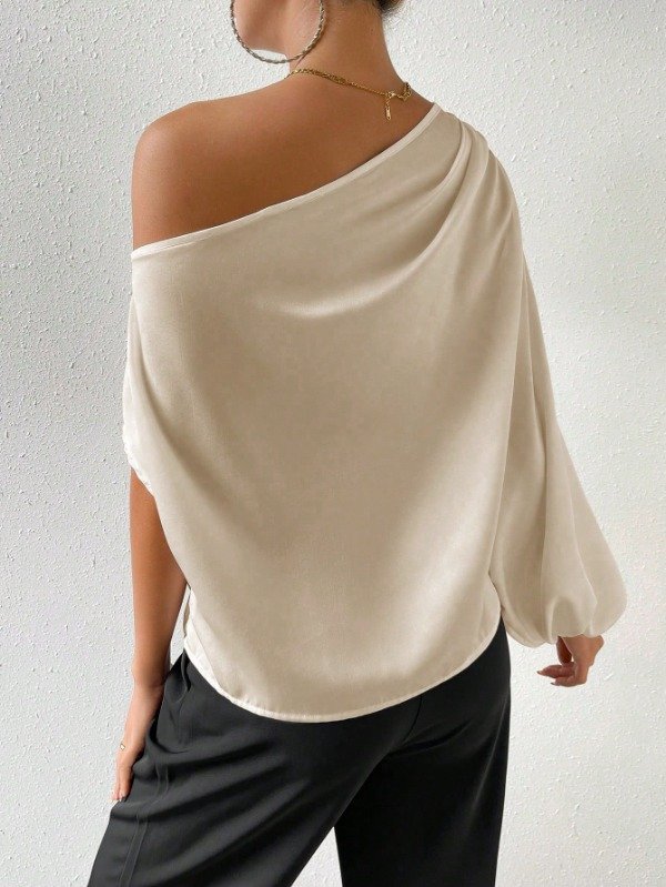 Blusa Cuello Asimétrico. Hombro Descubierto. Manga Farol con Elástico.
