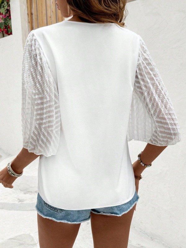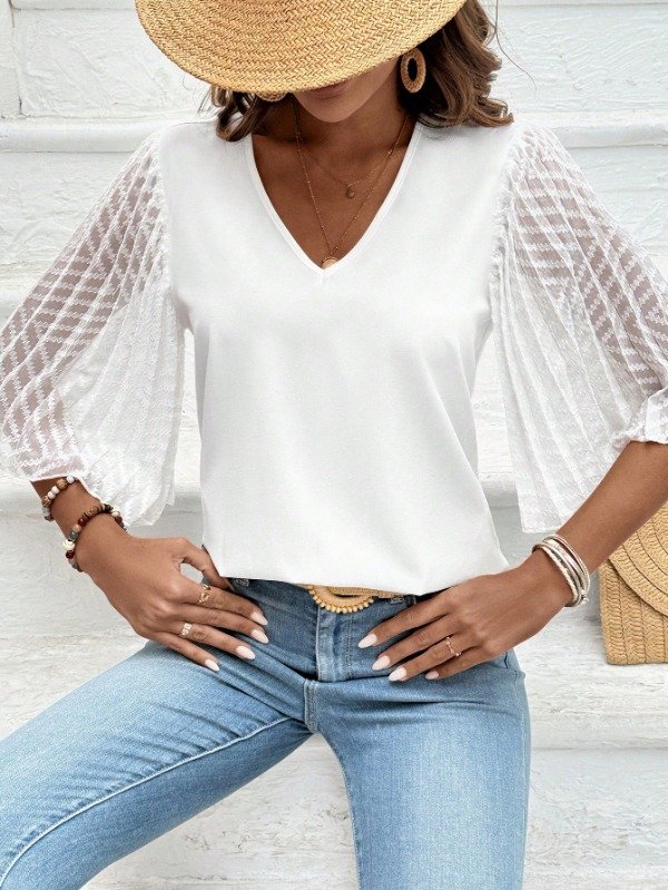 Blusa Escote en V. Manga 3/4 Mariposa Transparente Plisada.