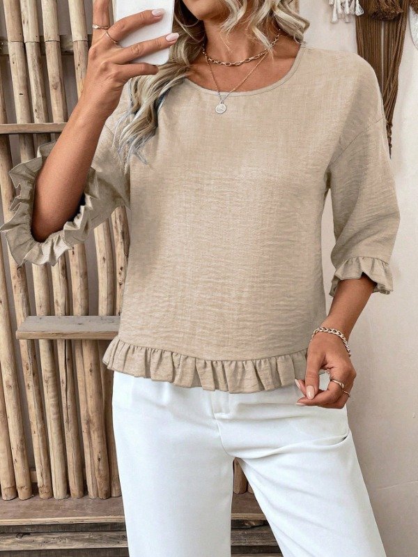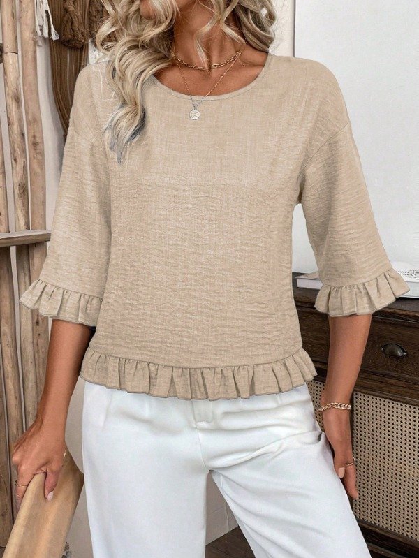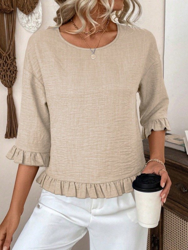 Blusa Escote Redondo. Prendida Atrás. Manga 3/4 con Voladito.