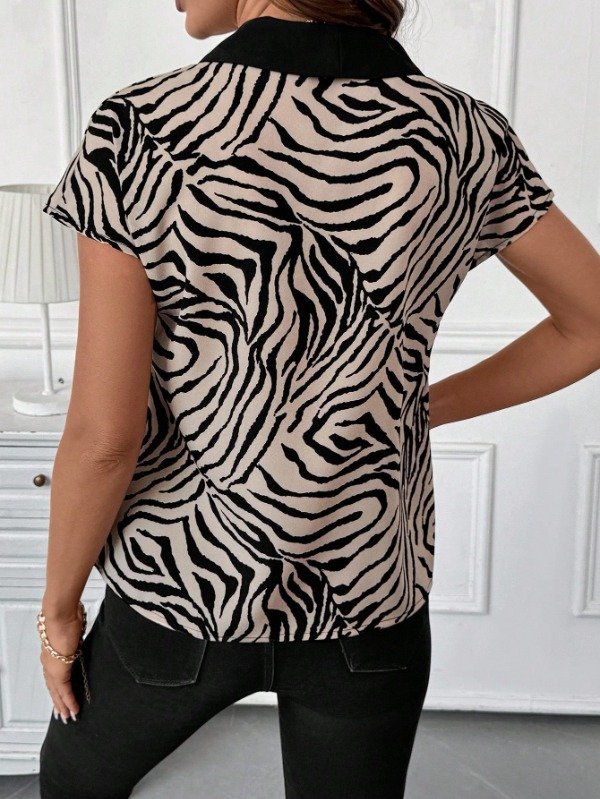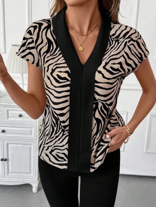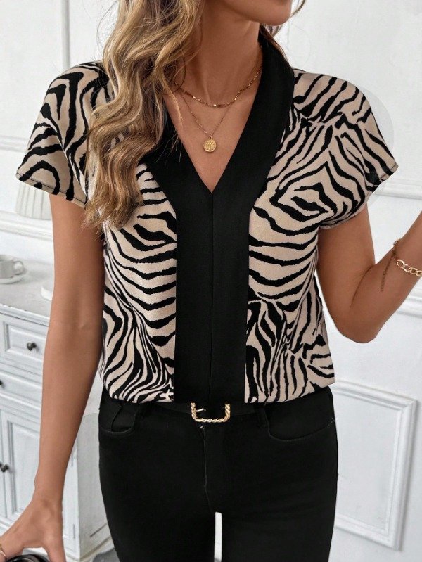 Blusa Manga Corta. Escote en V. Combinada Estampado Animal Print y Ribete Negro