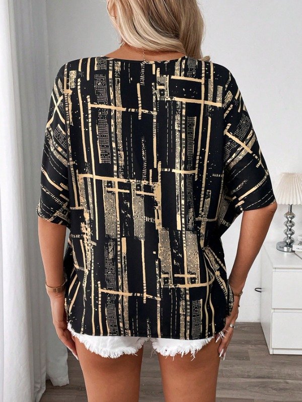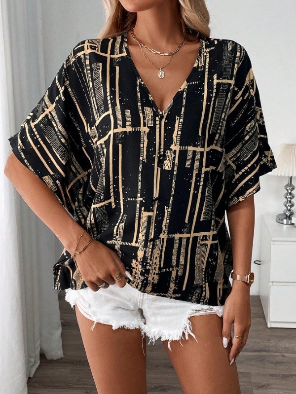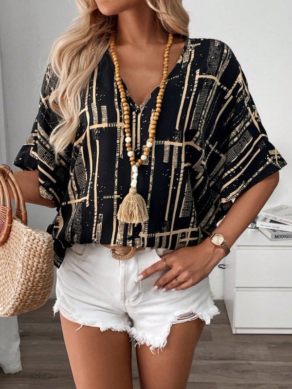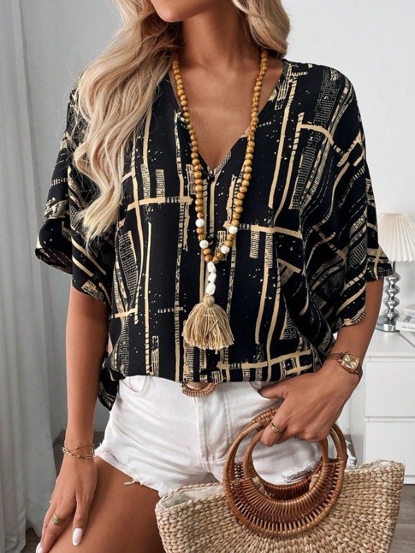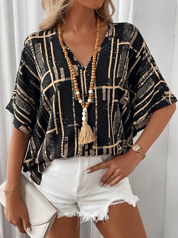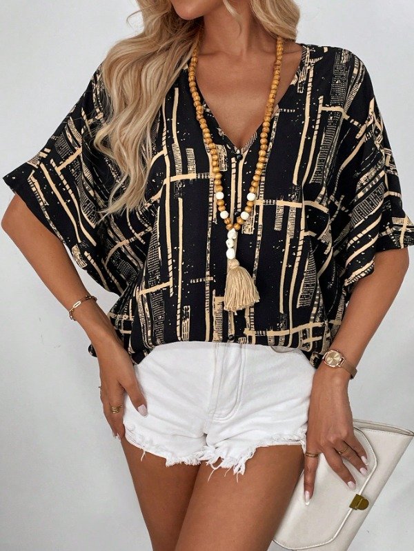 Blusa Escote en V. Manga Corta Murciélago. Estampada.