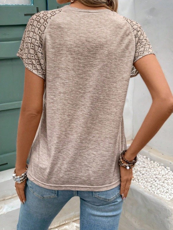 Remera Manga Corta Ranglan con Encaje. Escote Redondo. Tostado