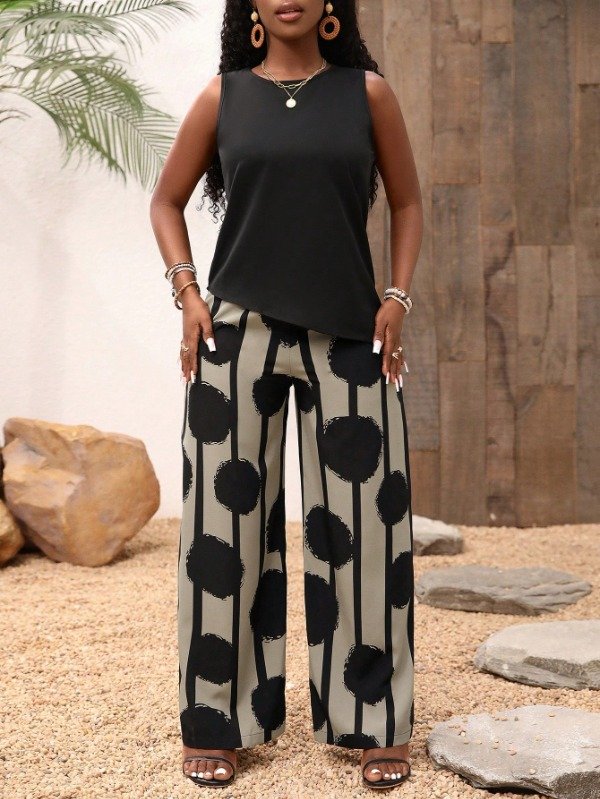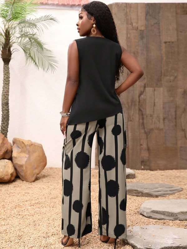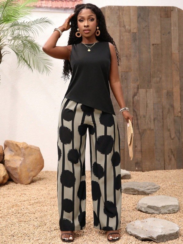 Conj. Musculosa Ruedo Asimétrico y Pantalón Recto Ancho Estampado Lunares.