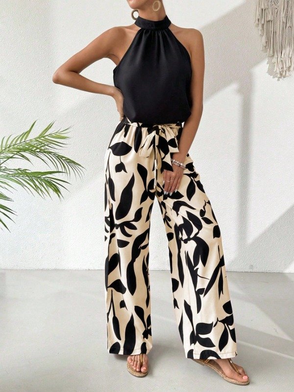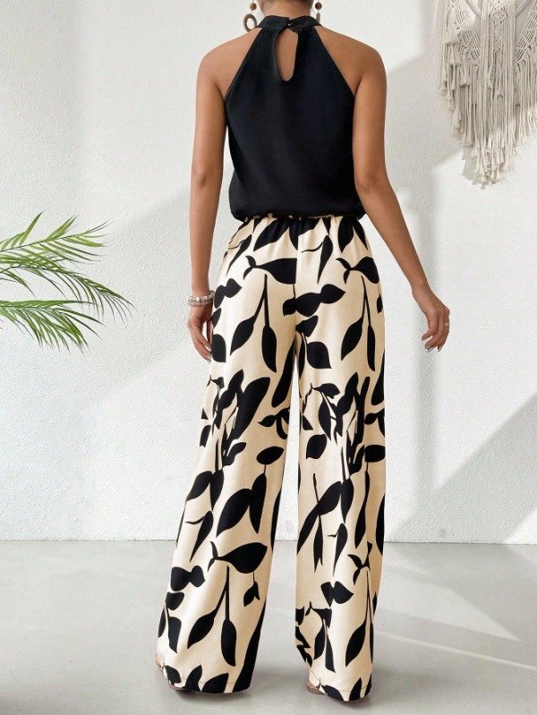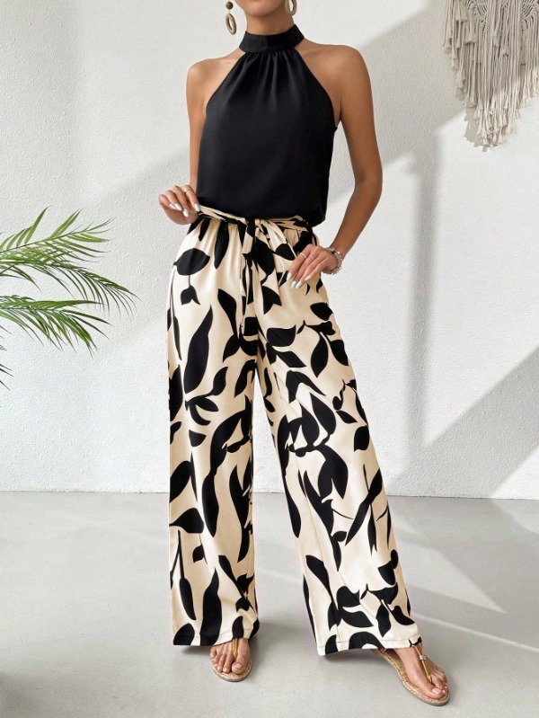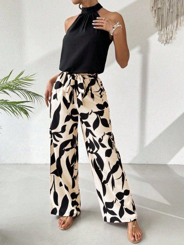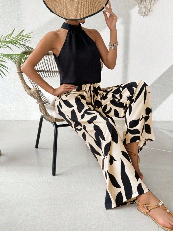 Conj. Pantalón Recto Tipo Pijama Estampado y Remera Sin Mangas Escote Redondo.