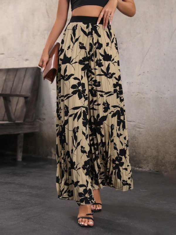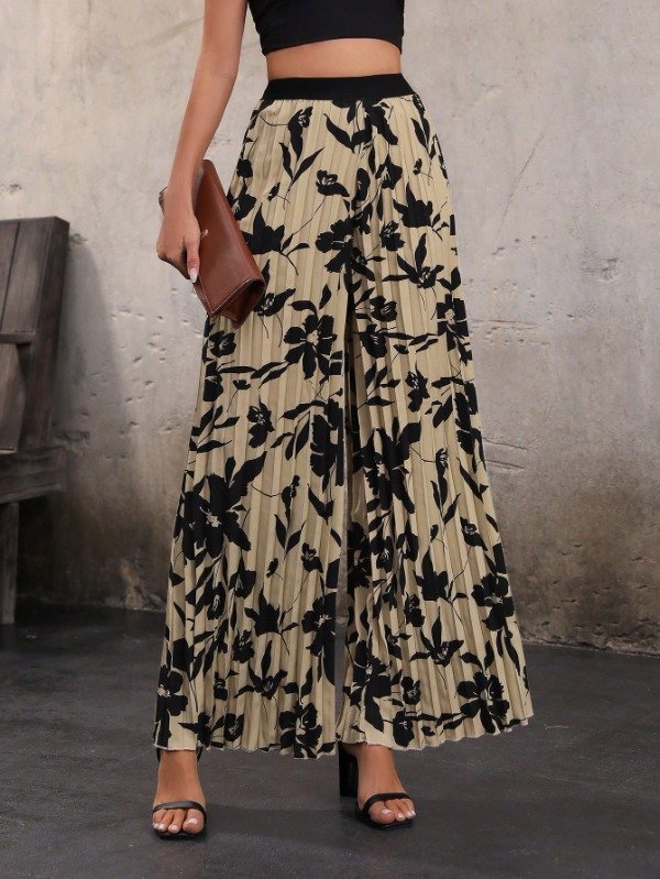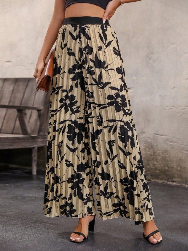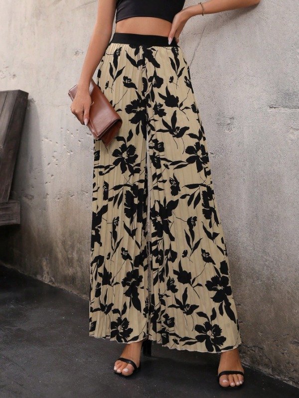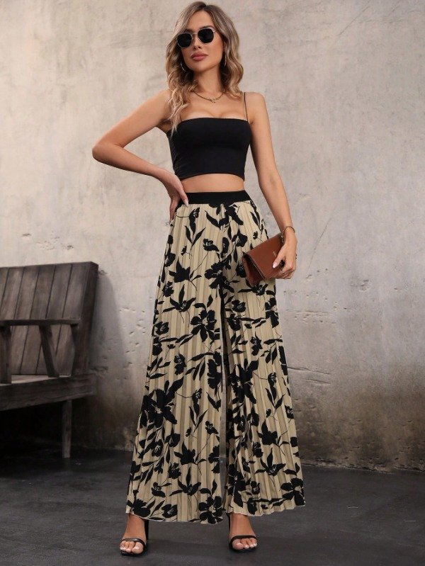 Pantalón Pierna Ancha Acampanado. Plisado. Estampado Floral. Cintura Elástica.