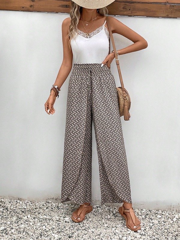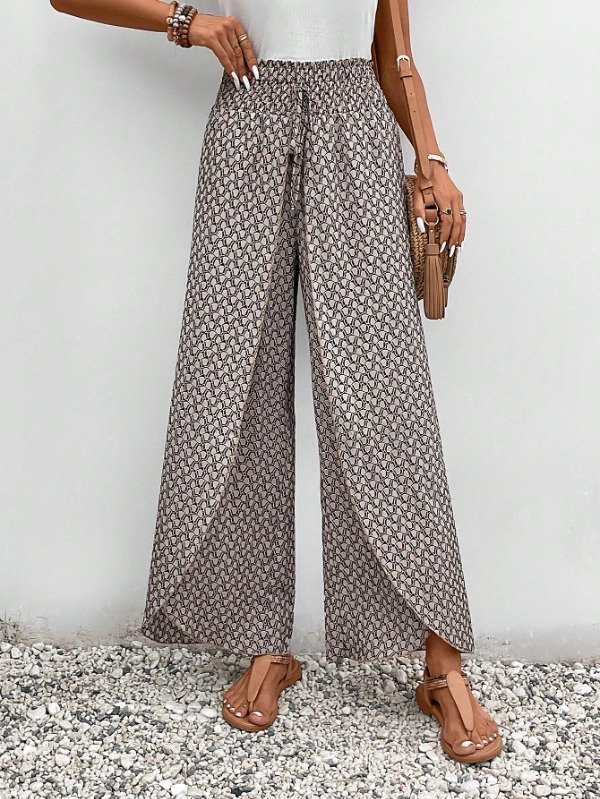 Pantalón de Pierna Ancha con Abertura Cintura Alta Elasticidad. Fantasía Marrón